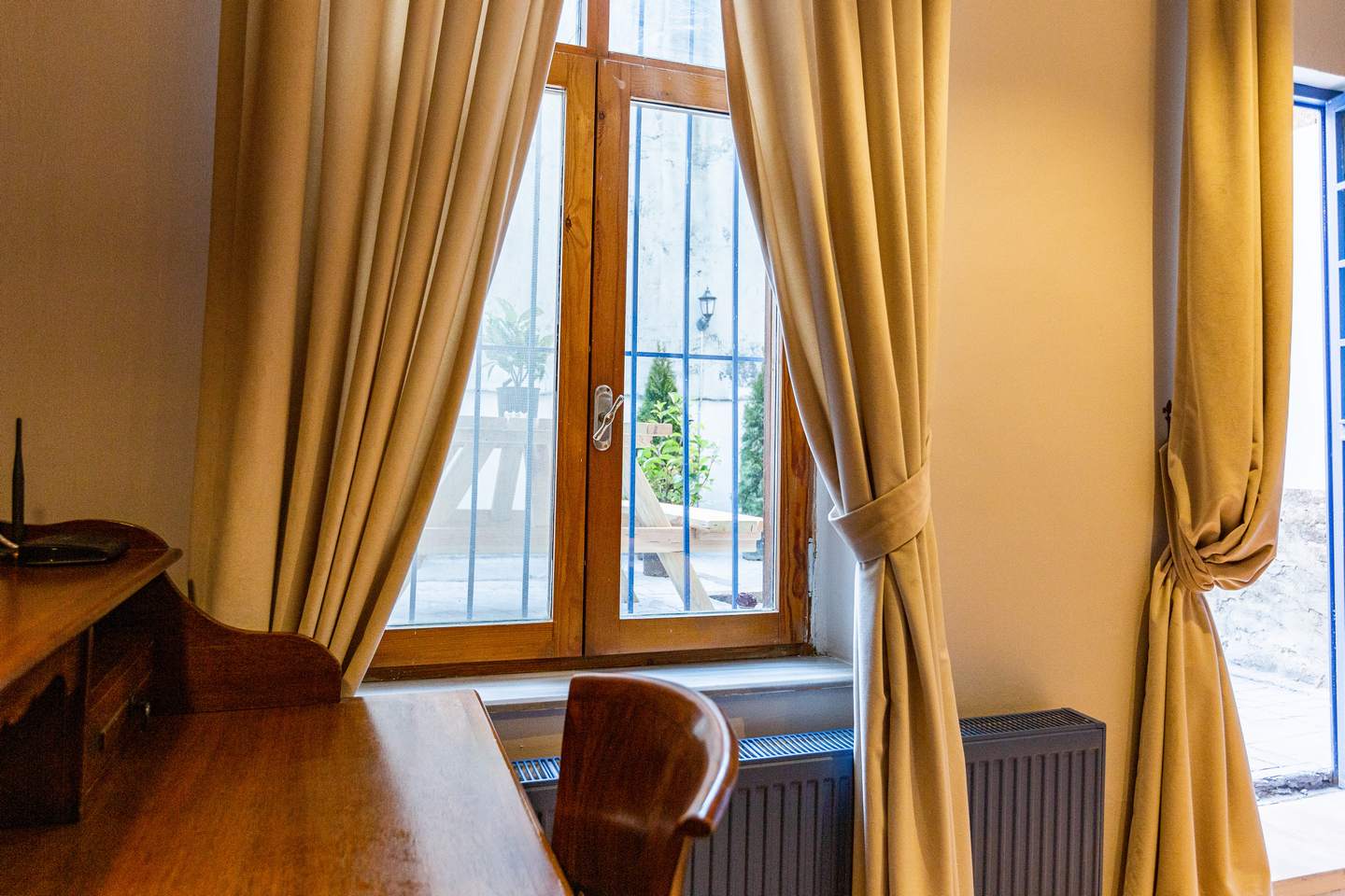There is a nice terrace with a fire-pit and an exquisite wooden table on the first floor.