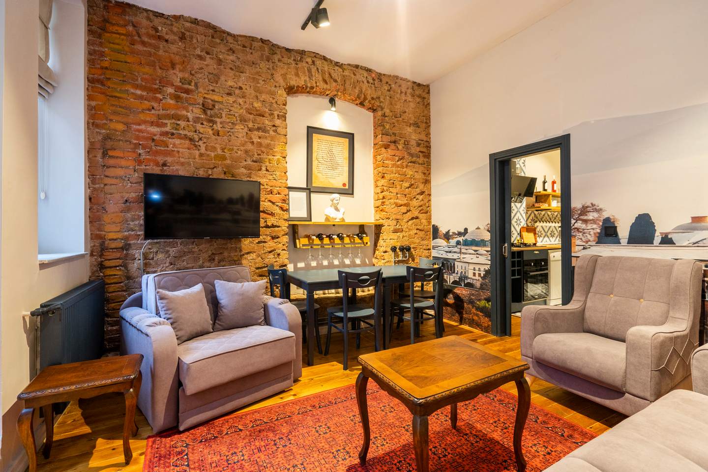 In the living room of first floor you have a dinning table for 12 people, tv (which has IPTV that you can watch all the world channels). One sofa that would be a double bed if it is needed. In the living rooms there is also one seat that would turn to a single bed. First floor Living room has acamodation for 2 people and second floor living room (which is used as 4'th bedroom) has accomodation for 3 people to sleep.